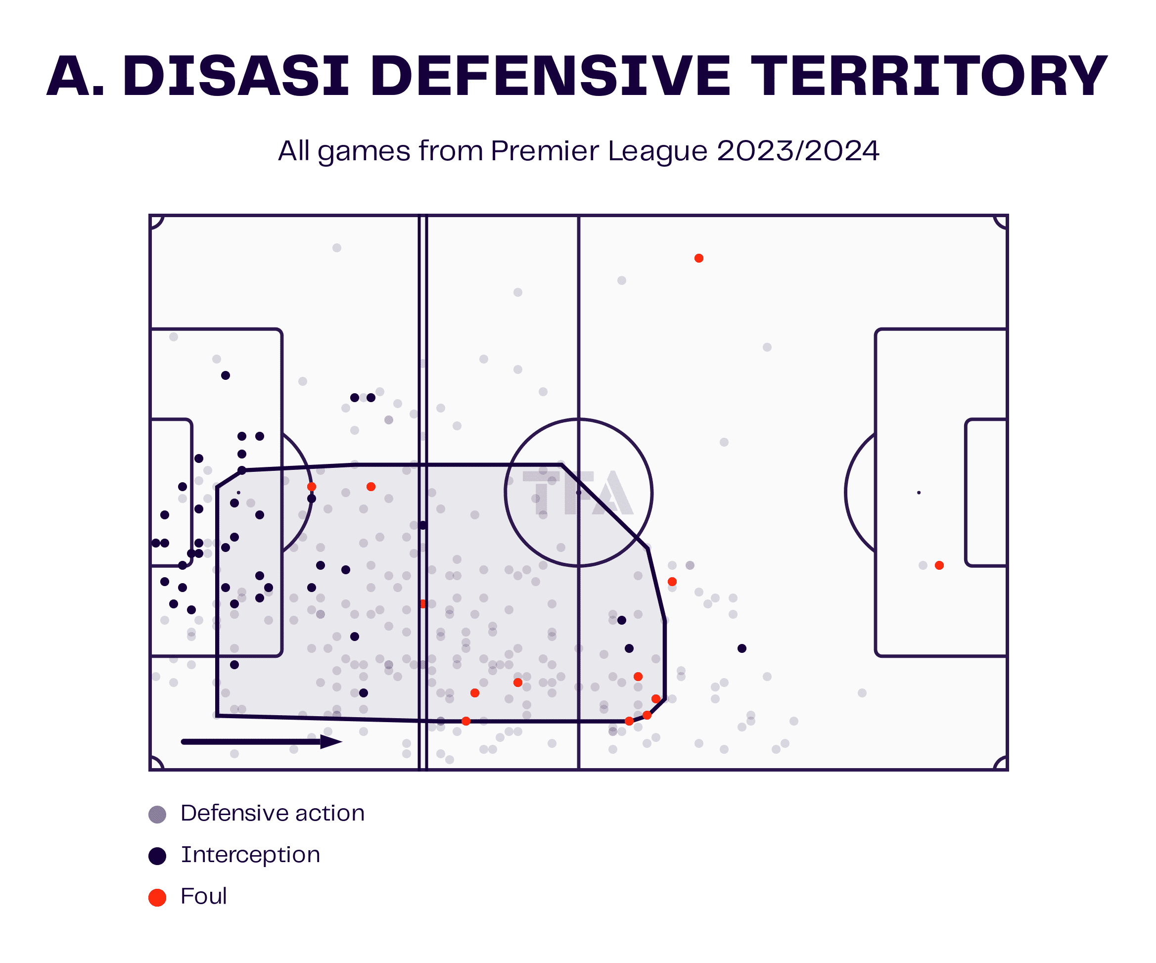 Another strong area in Disasi’s game is his ability to make recoveries high up on the field. Disasi puts pressure on the opposition players and makes counter-pressing recoveries in the attacking half.
