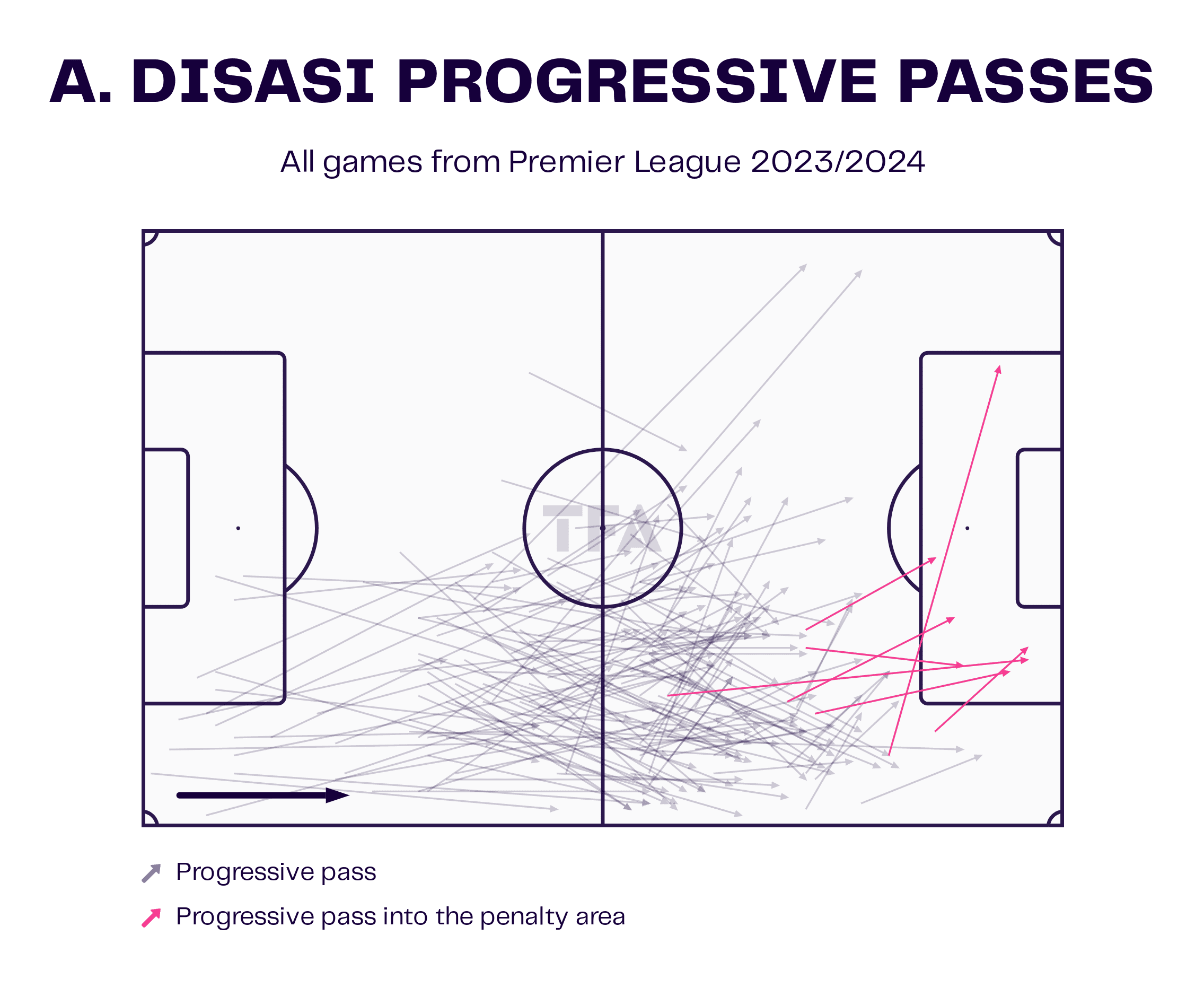 In addition to his defensive skills, Disasi possesses the ability to move the ball forward. He attempts 63.5 passes per 90 minutes and most of these passes are made to find a runner down the flank.