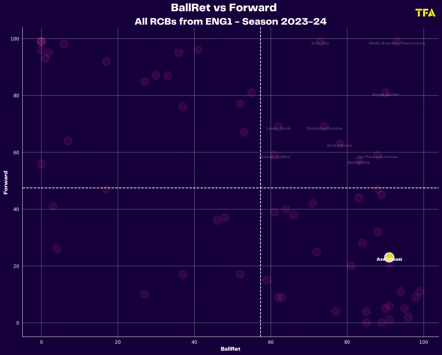 This visual evaluates the balance between retaining the ball under pressure and the ability to play forward passes. Those excelling in both aspects control the game’s tempo and direction. Disasi recovers the ball well in tight situations but has struggled a bit to move the ball forward.