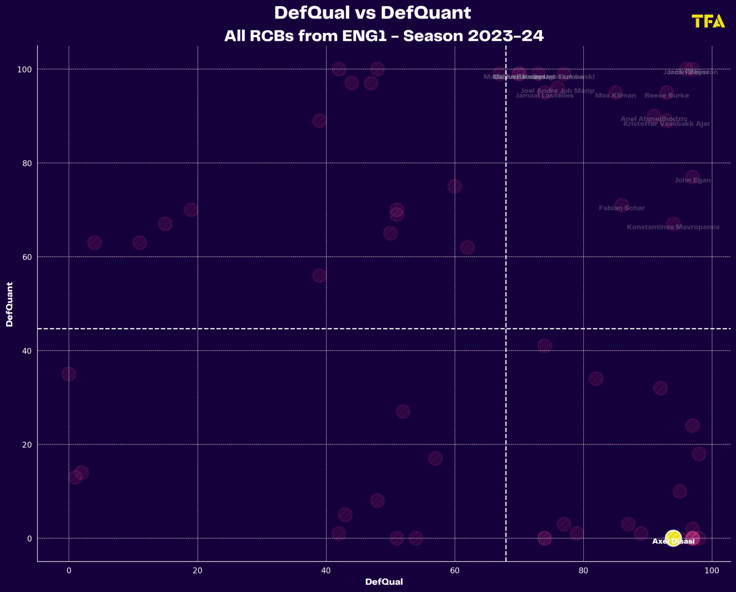 This plot measures the quality and quantity of a defender’s defensive actions. A player in the top right quadrant consistently engages in many defensive actions and performs them effectively. Disasi is not involved in a lot of defensive actions. However, he can win duels and that is why he is in the bottom right quadrant.