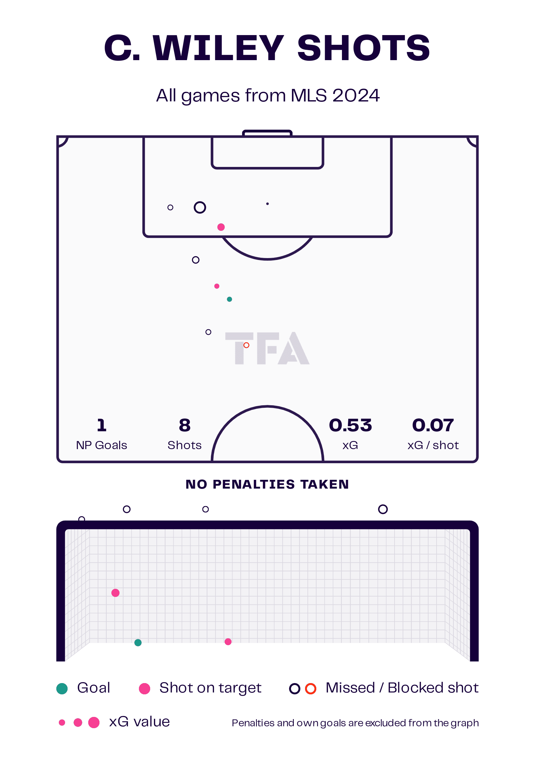 Caleb Wiley is quite effective when he gets the ball on the left side. His ability to cross the ball and find a teammate in danger zones makes him a threat to any opposition’s defence. Wiley completed around 44% of his crosses. The above visuals show that these passes landed around the six-yard box. The conversion rate was on the lower side by his teammates.