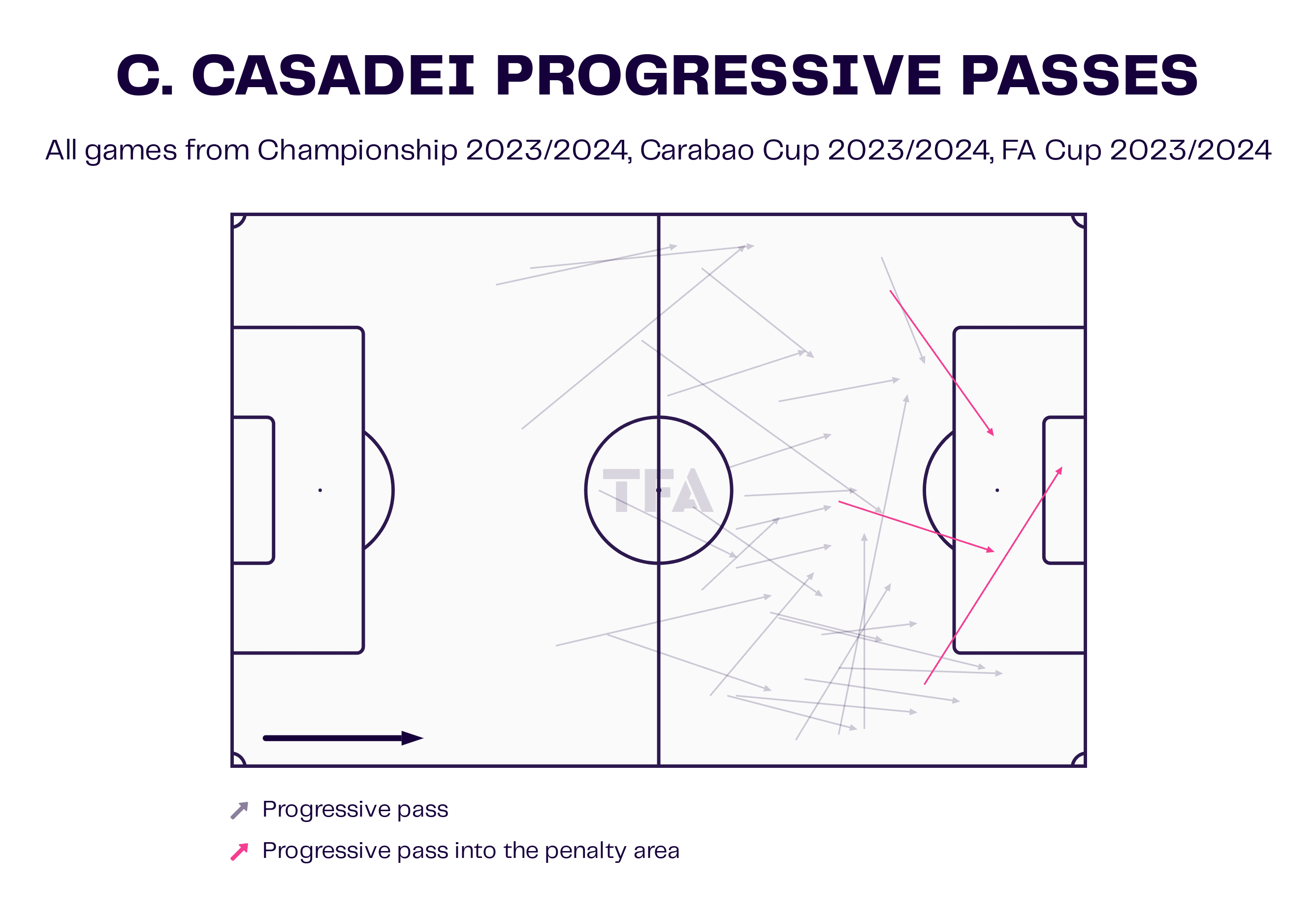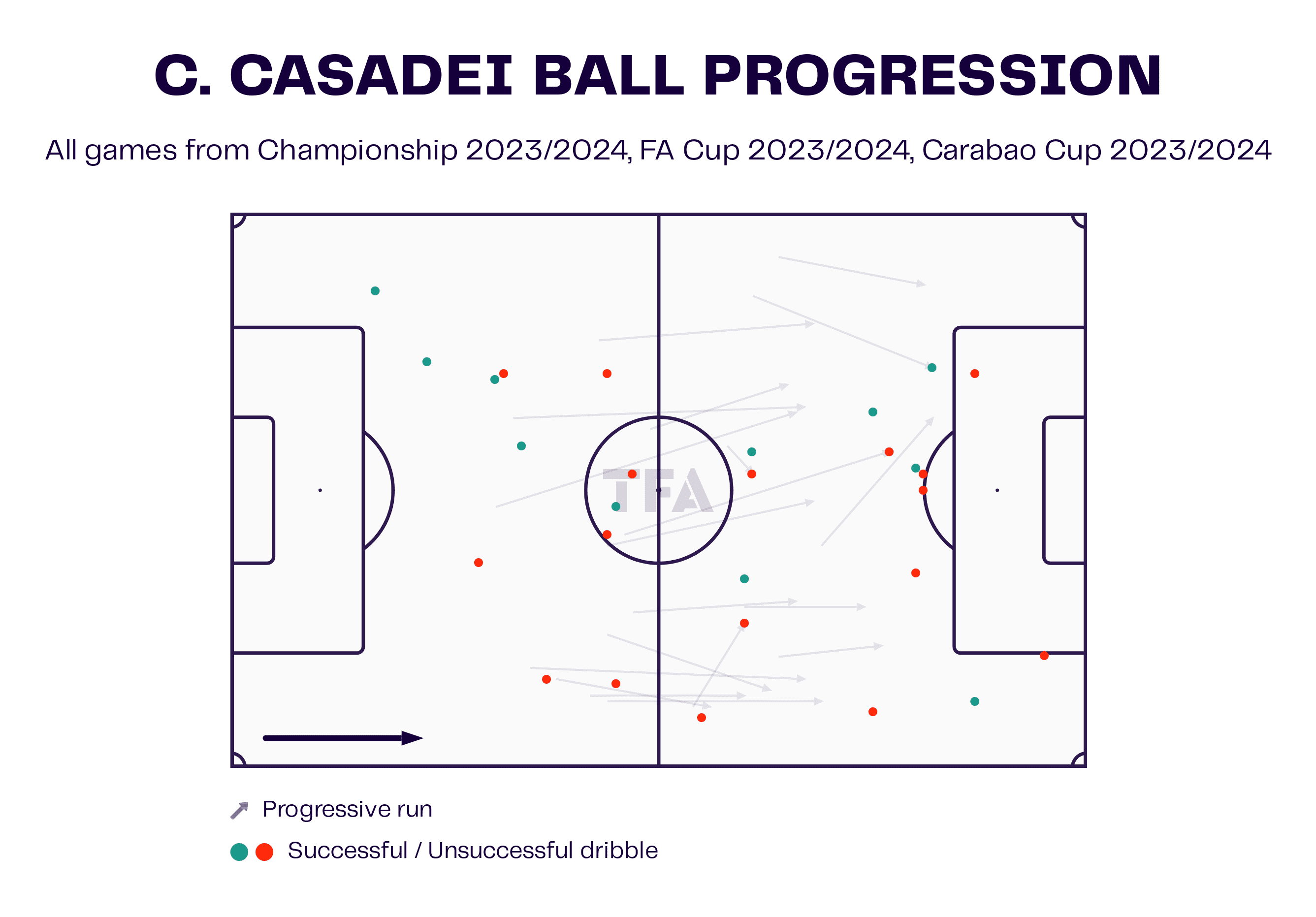 Most midfielders like to make runs from the centre of the park and carry their team. Cesare Casadei also made some progressive runs and most started in the defensive half.