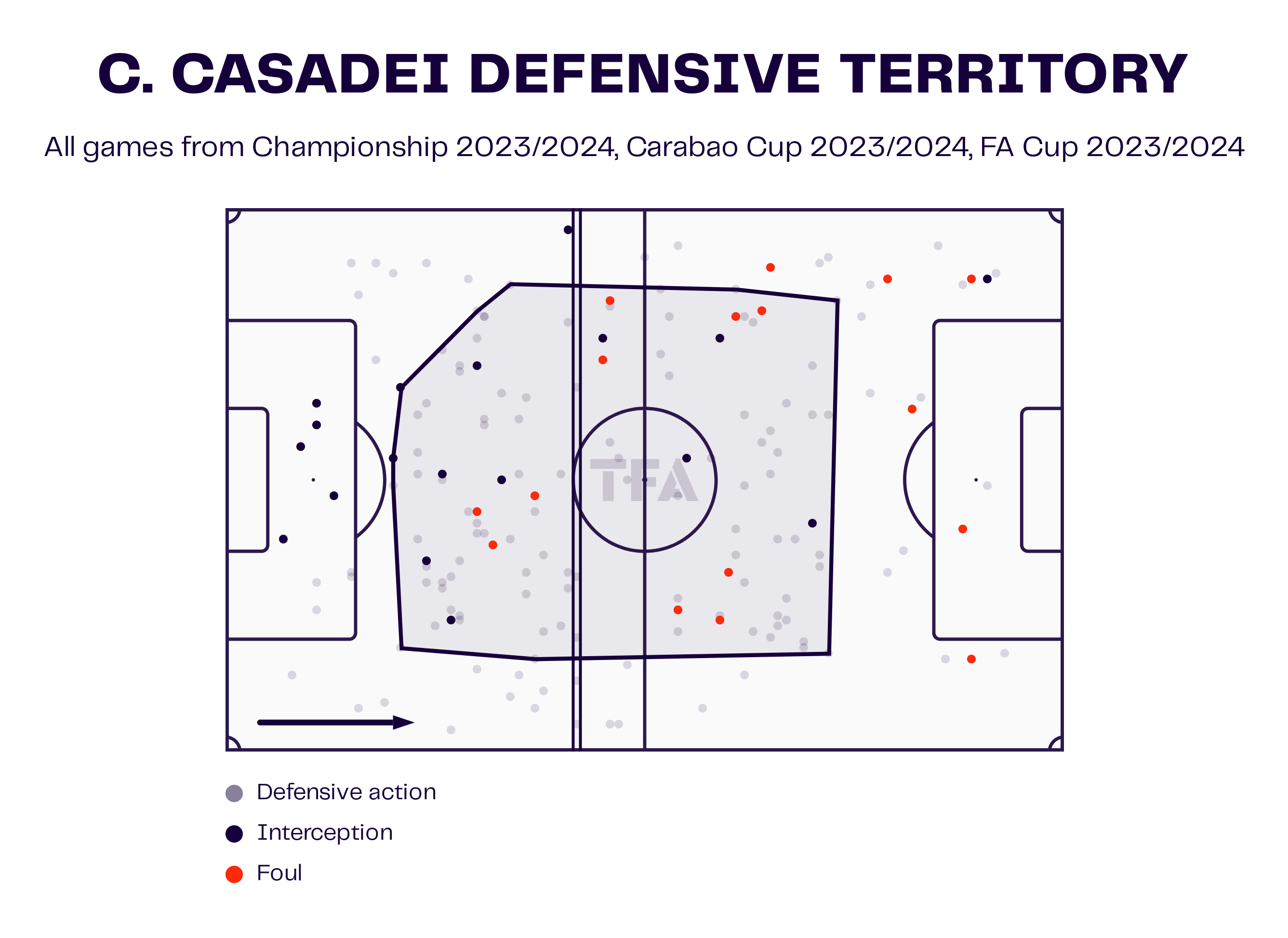 In addition, the youngster made some big recoveries in the attacking half as well. Cesare averaged around 5.8 recoveries per 90 minutes and 40% of these recoveries were made in the attacking half. By looking at the above viz we can observe that Casedei made a few dangerous and a few counter-pressing recoveries. Most of these recoveries were made in the centre of the park.