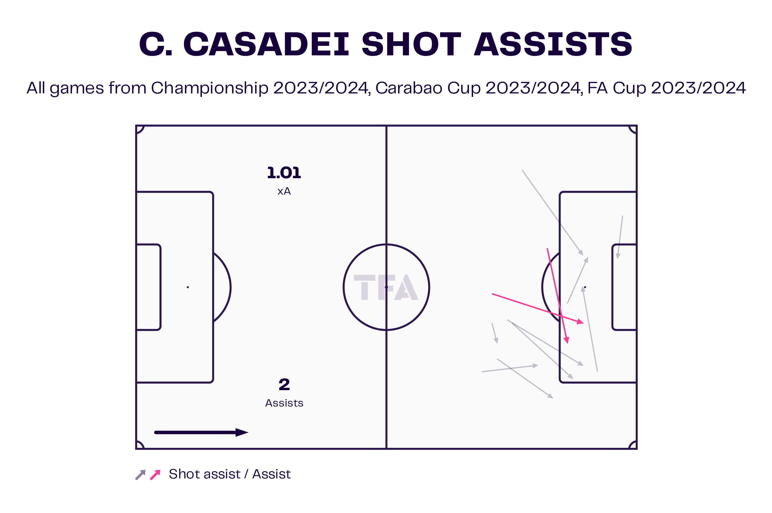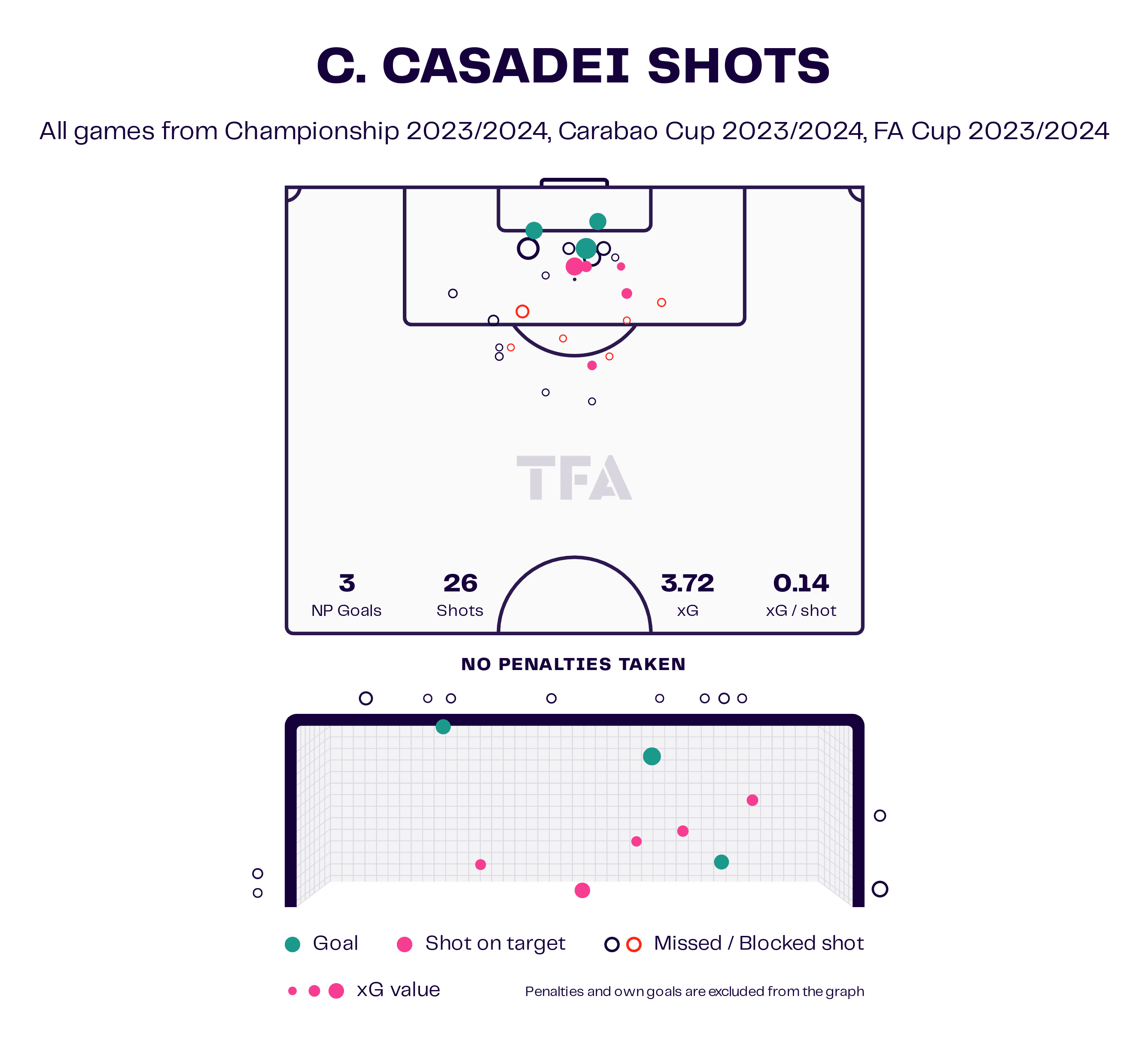 In addition to two assists were three goals scored by the midfielder. Casadei attempted 26 shots and had a 31% accuracy rate. He took around 2.2 touches in the opposition penalty box and scored all goals from a close range from inside the penalty box.