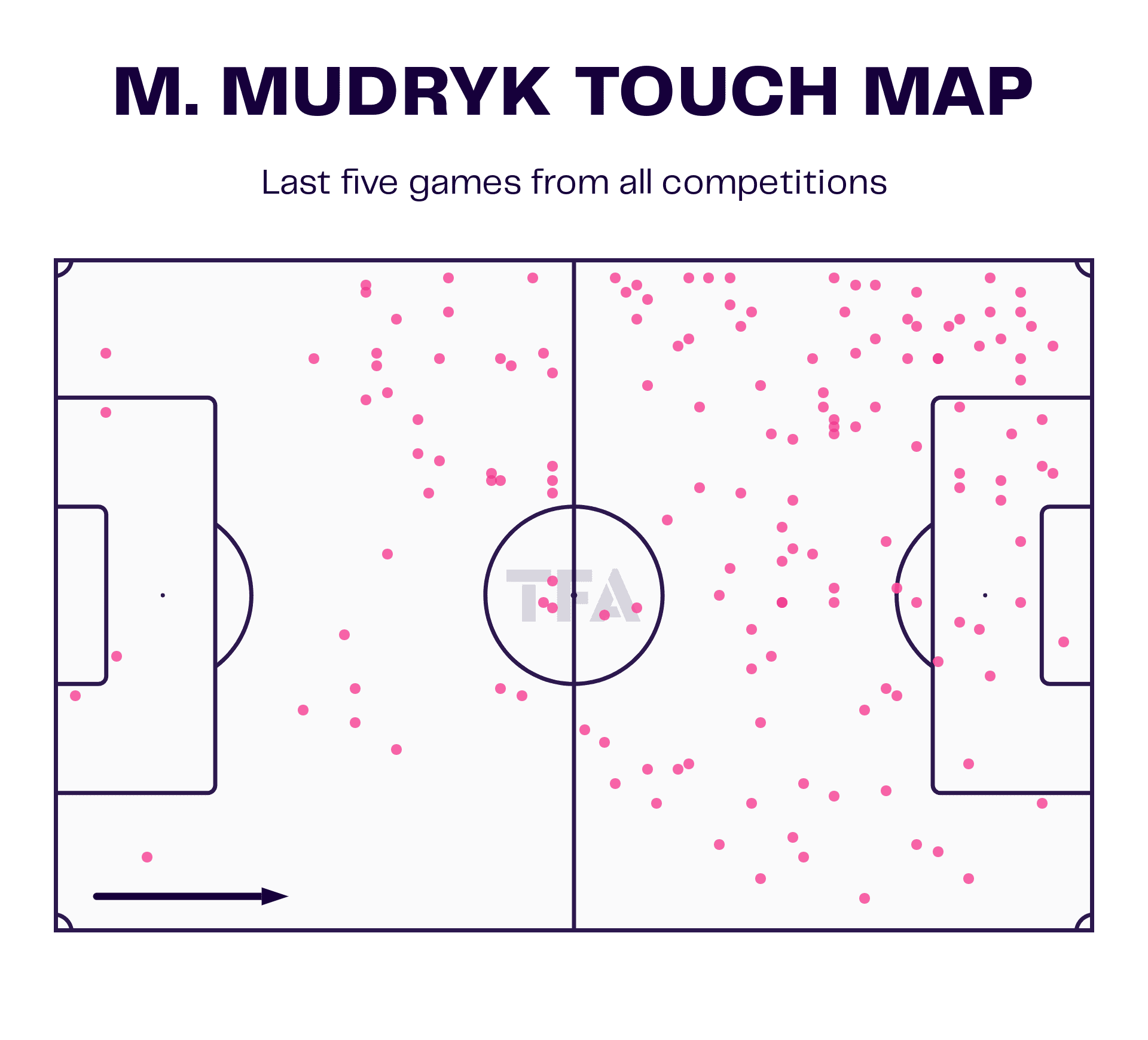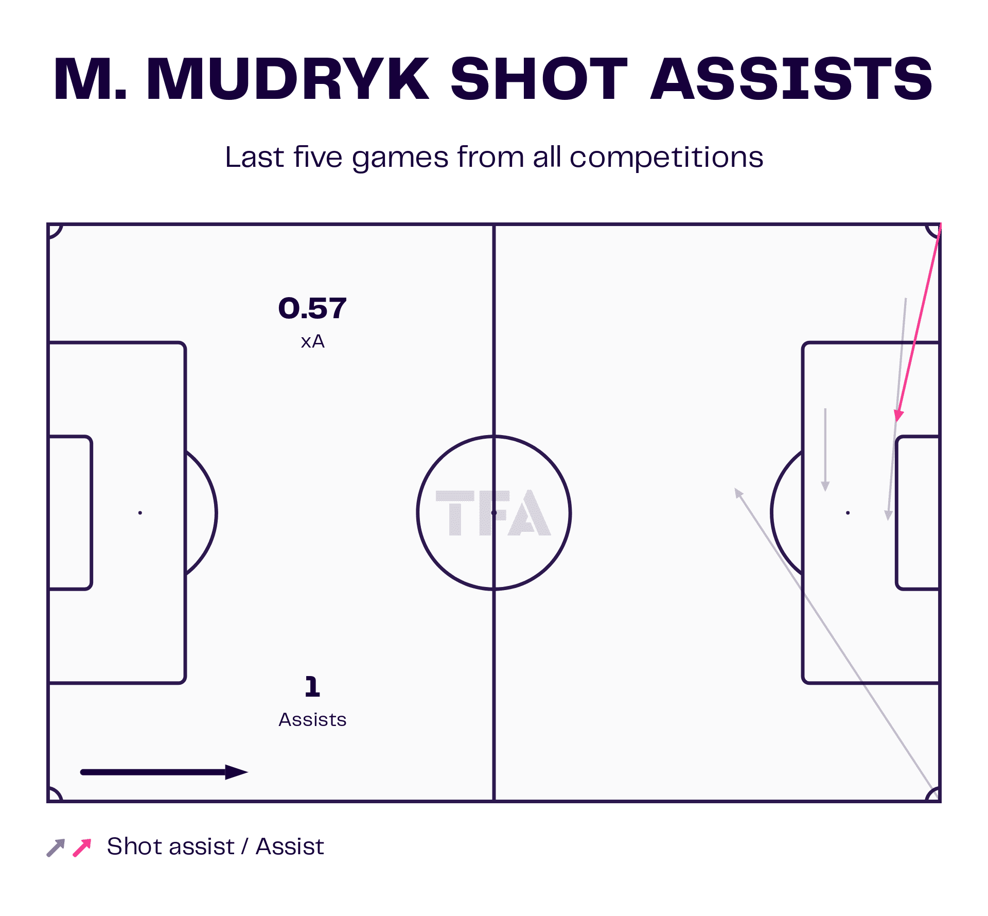 During these five games, Mudryk provided his first assist of the season. The youngster delivers constant crosses in danger zones. He averages 3.2 passes to the opposition penalty box per 90 minutes in the current season and delivers 45% of these passes. In these last five games, the average is above four passes per 90 minutes.