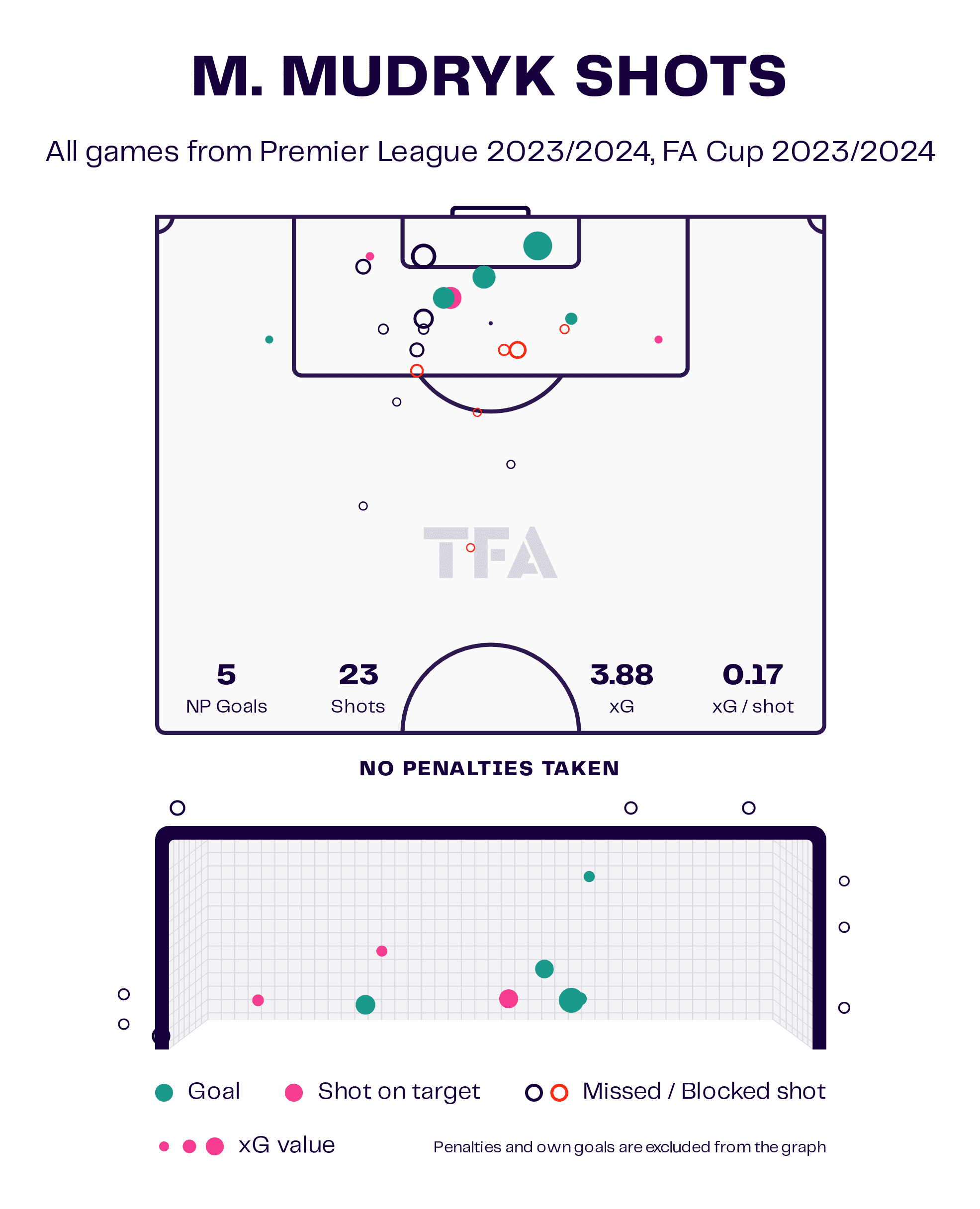 Mykhailo Mudryk has spent 1,306 minutes combined in the Premier League and the FA Cup. The forward has netted five goals combined in both competitions. He averages 1.6 shots per 90 minutes and has an accuracy rate of 35%.