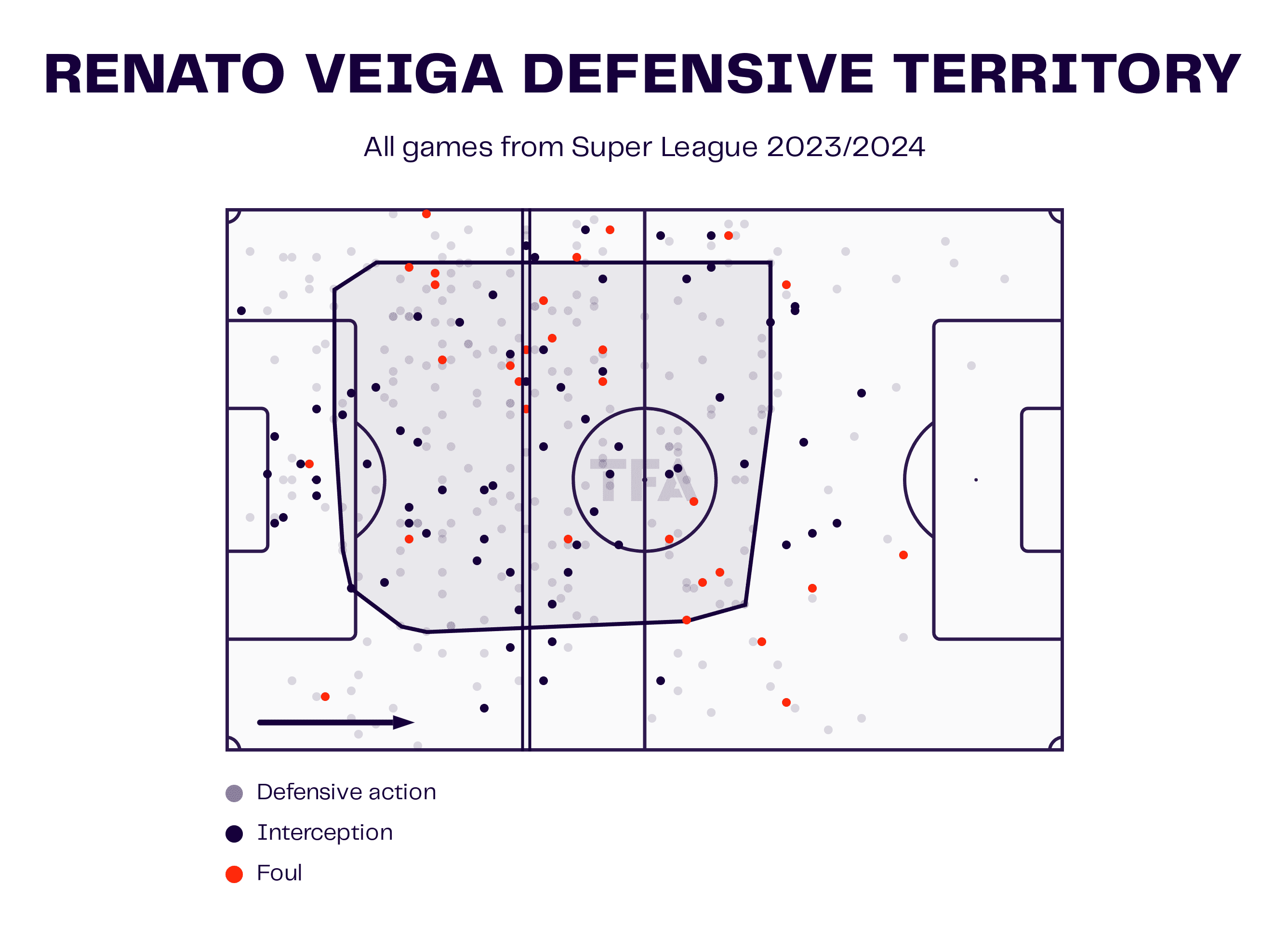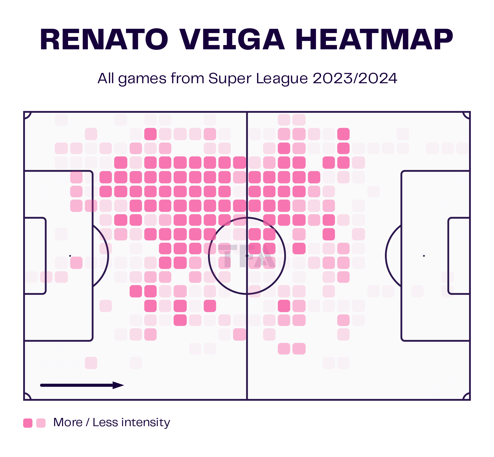 Renato covers a lot of areas on the field. He can go wide on occasion and get involved in plays. The heatmap also indicates that Veiga gave a lot of defensive cover to his teammates at the back.
