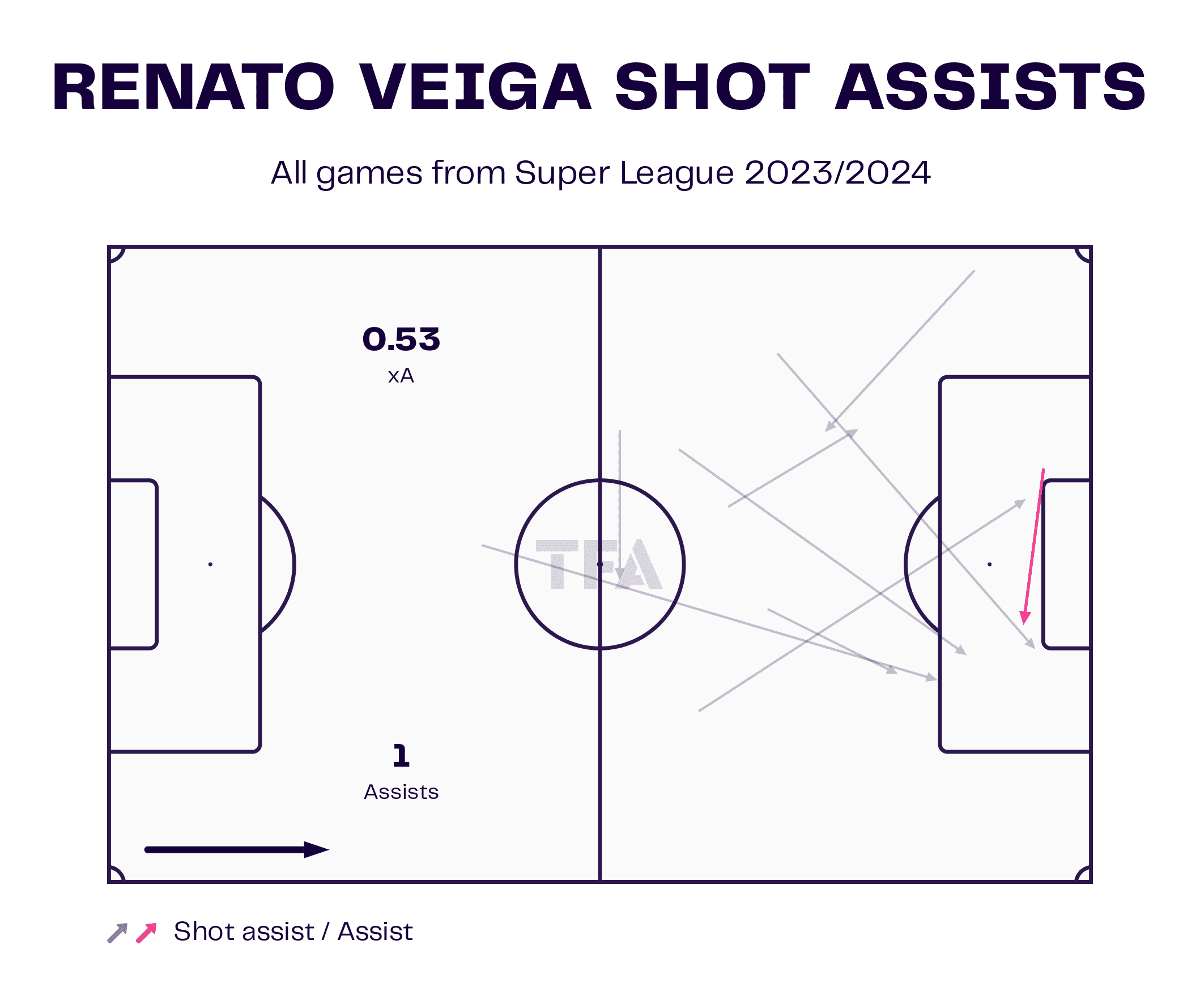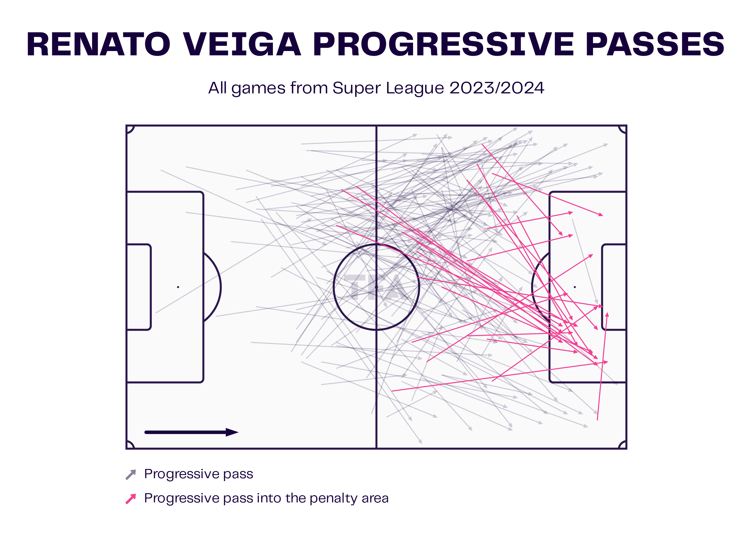 Renato Veiga was highly rated for his passing abilities. His progressive passes show his vision and range of passes. The youngster has attempted a few diagonals to find a teammate in attacking areas inside the opposition penalty box.
